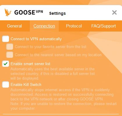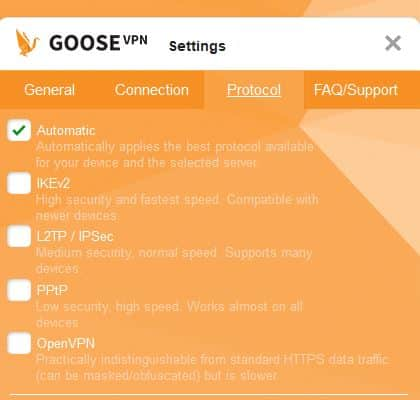 When configuring your connection settings in GOOSE VPN, users have flexibility regarding protocol selection. You can manually choose your preferred protocol based on your specific needs, or alternatively, enable the automatic protocol selection feature.