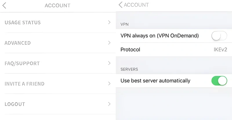 The iOS application delivers core VPN functionality with streamlined settings: persistent connection toggles, protocol selection, and automatic server optimization. While sufficient for basic needs, advanced users may find the feature set somewhat restricted.